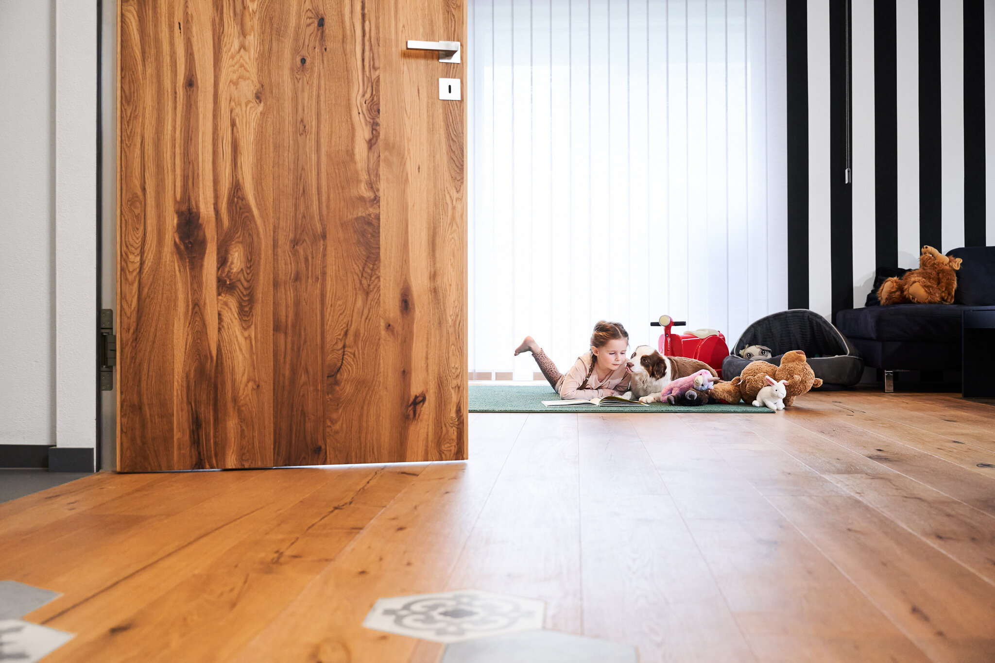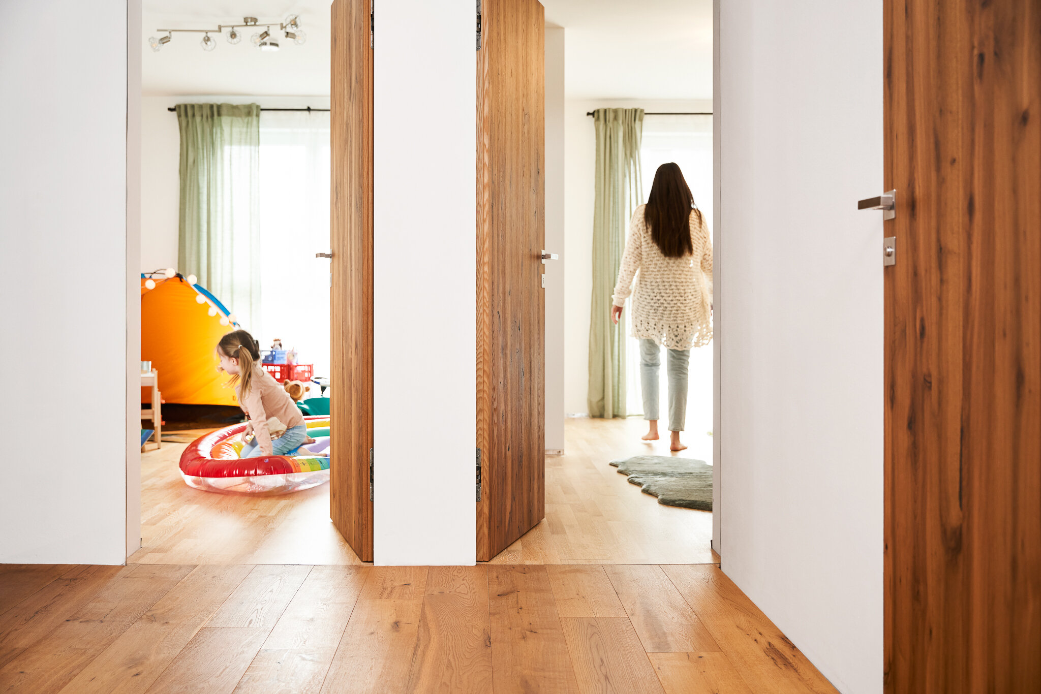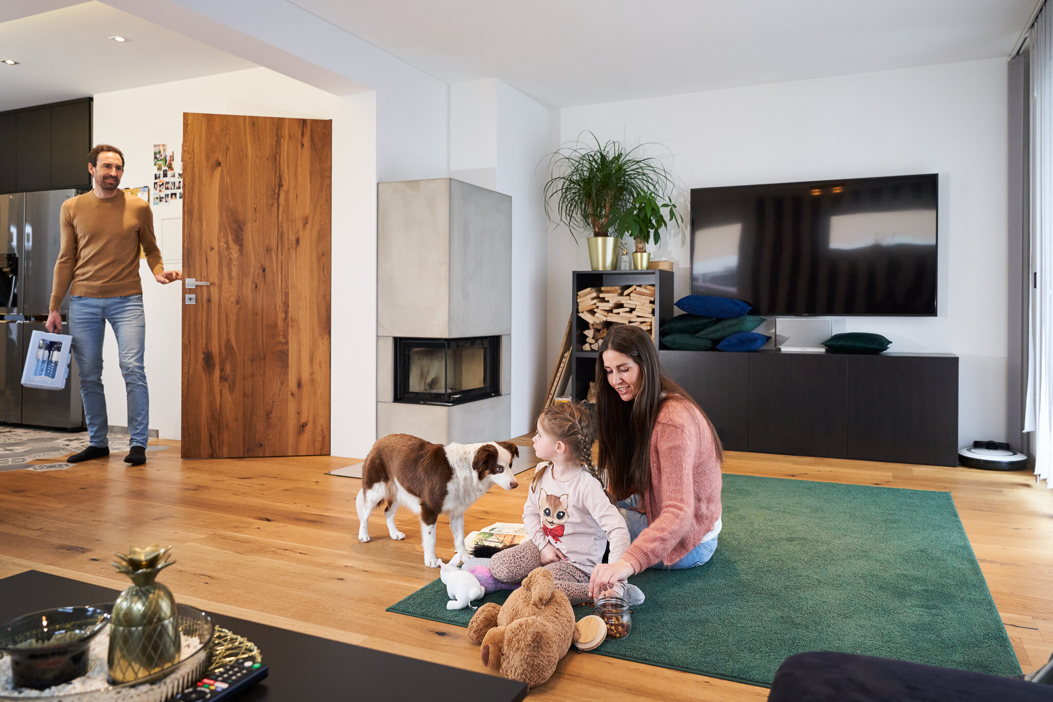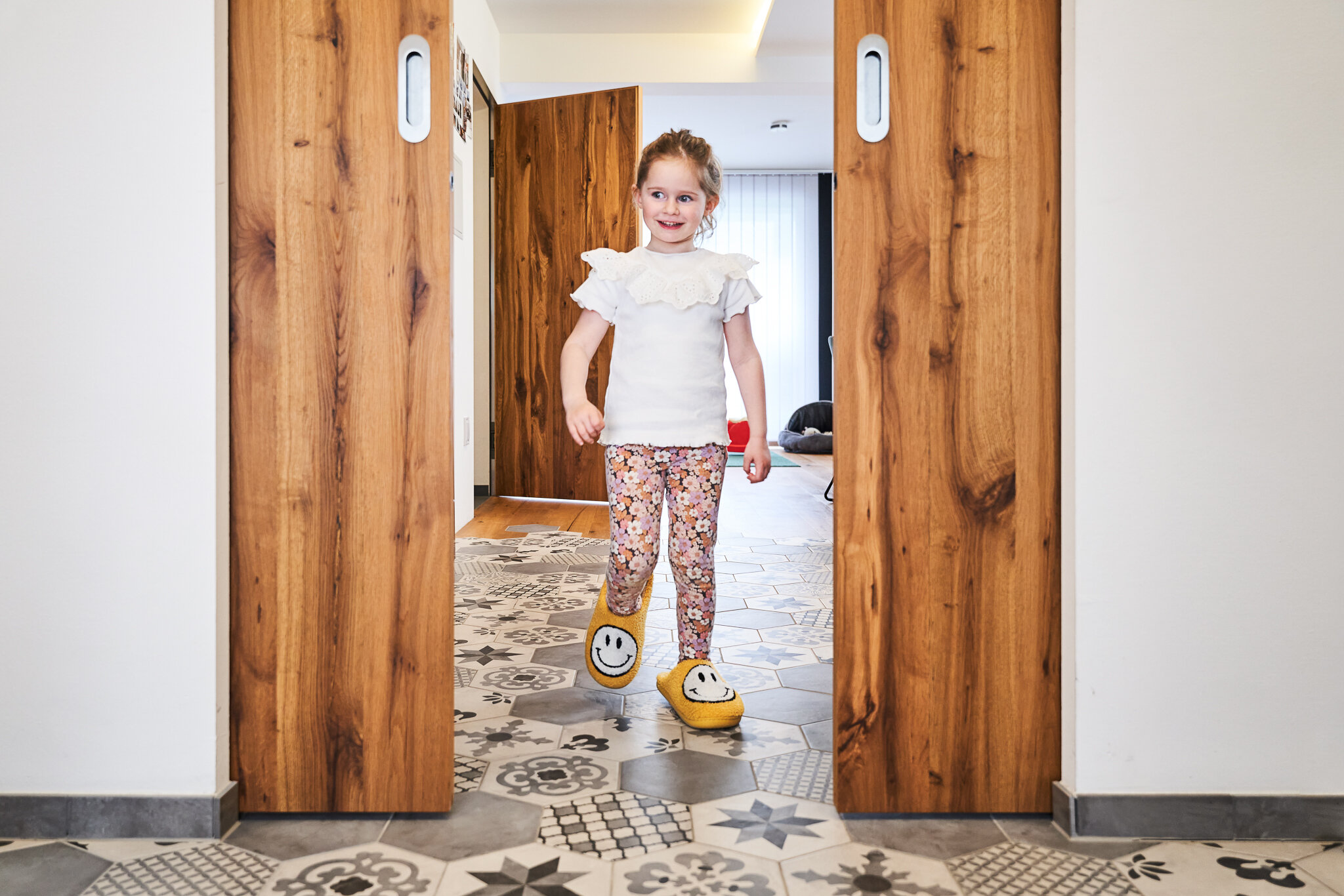 Unser Tischler war unsere Schnittstelle, hat uns bestens beraten und uns unterschiedliche Varianten und Möglichkeiten gezeigt. Somit konnten wir einen guten Eindruck gewinnen, welche Türsysteme es gibt und auch welche Hölzer und Oberflächen. Früher dachten wir immer, einen Türstock gibt es nur sichtbar. Als wir dann bei Koch Türen auf das System Infinity aufmerksam wurden, waren wir begeistert und zum Glück noch in der Planungsphase, so dass wir die Vorkehrungen dafür im Rohbau beziehungsweise bei den Verputzarbeiten treffen konnten.