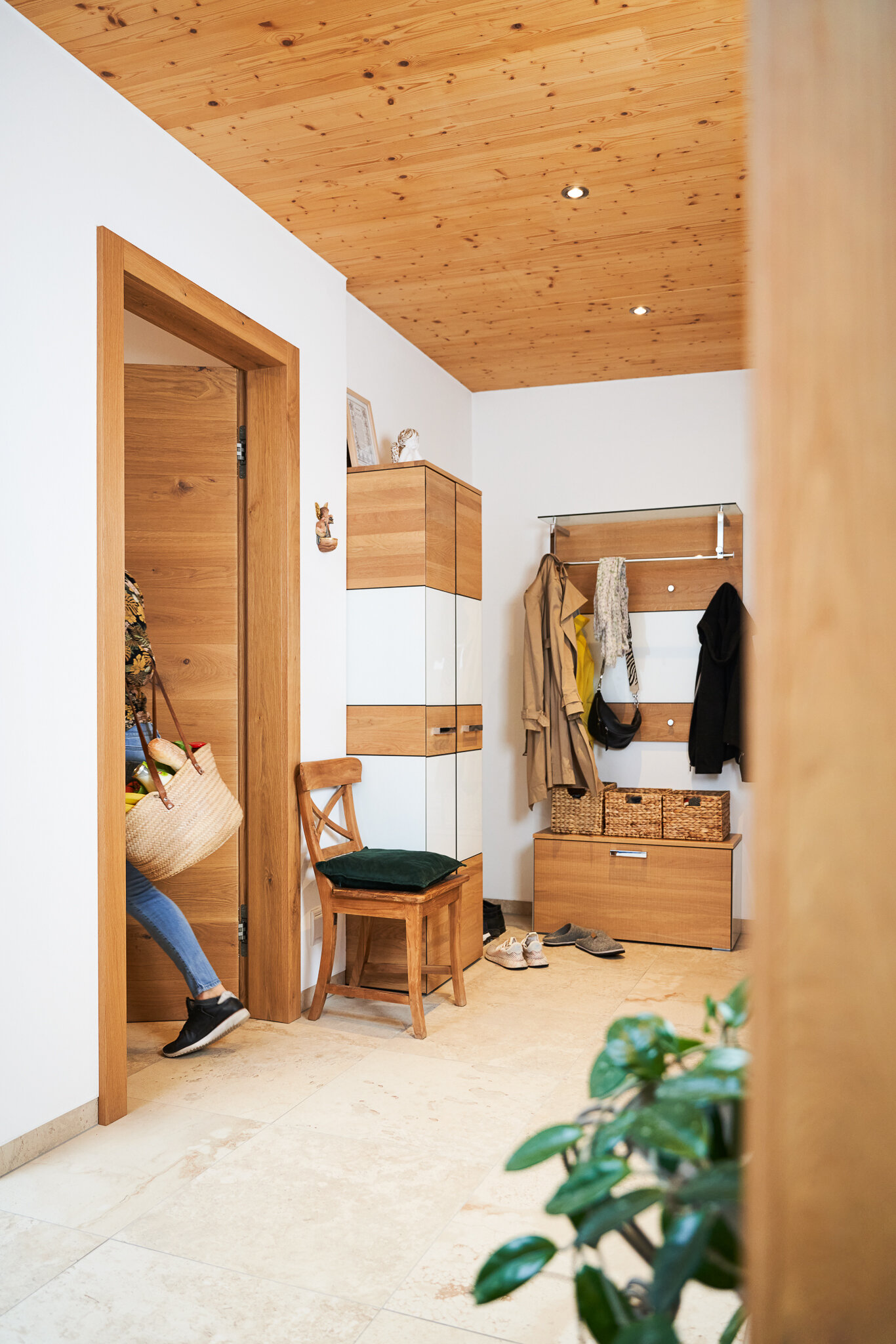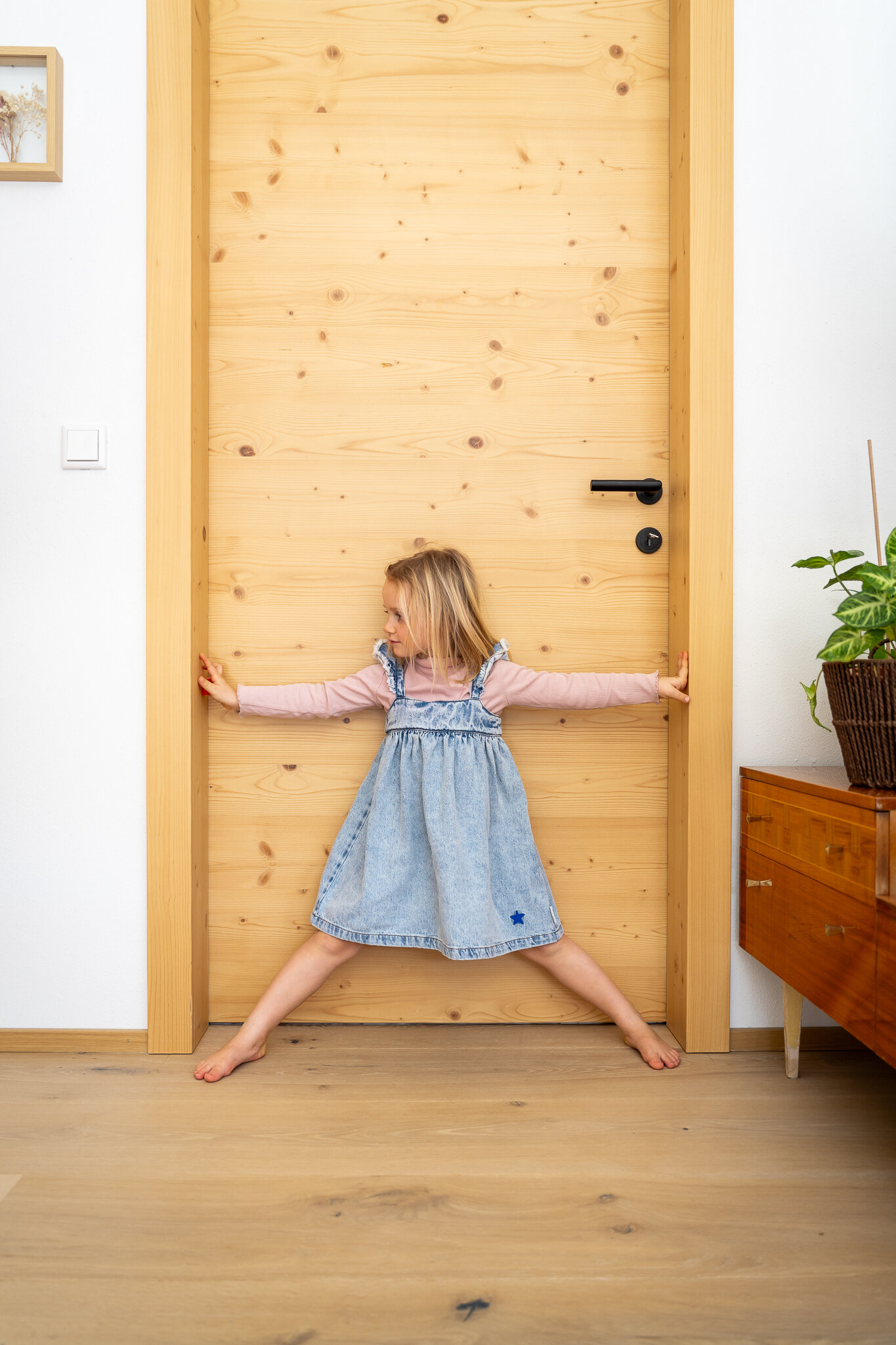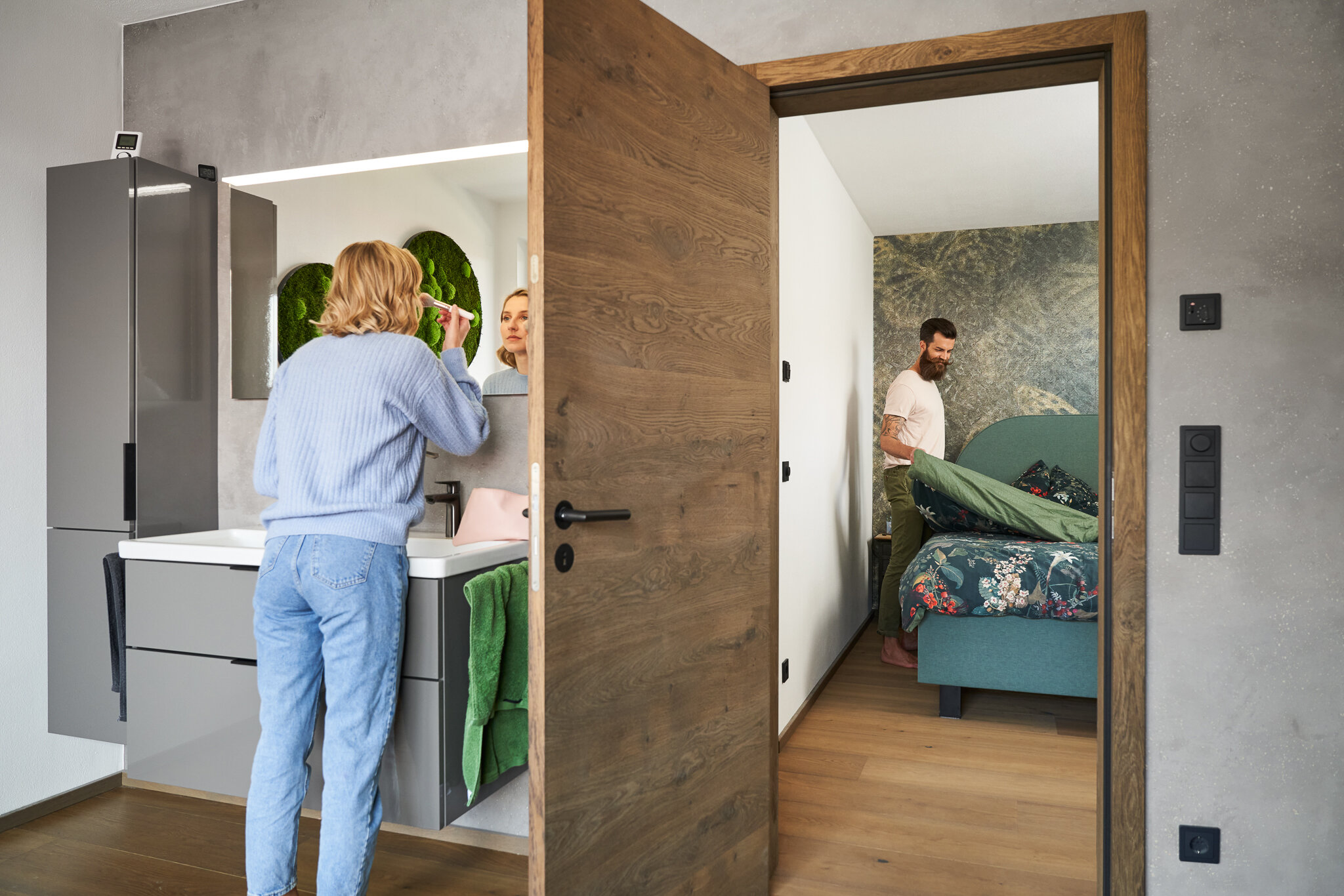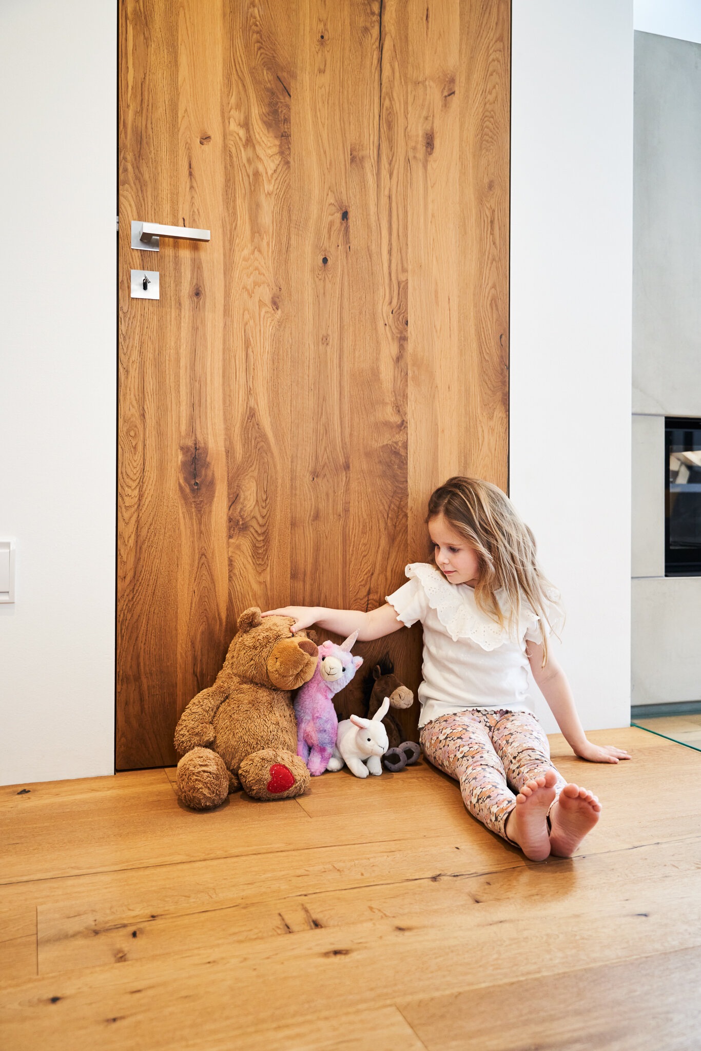 Für Privatsphäre sorgen Koch Türen, die hier im Wohnhaus der O.s verbaut wurden. Entschieden hat man sich für das System Avantgarde mit einer dunklen Oberfläche. Damit wirkt das System dominanter und stärker, ohne dabei aber aufdringlich zu wirken. Die dunkle Oberfläche der Türen ist ein bewusst gewähltes Stilelement, um den Räumen ein besonders Flair und Eleganz zu verleihen.