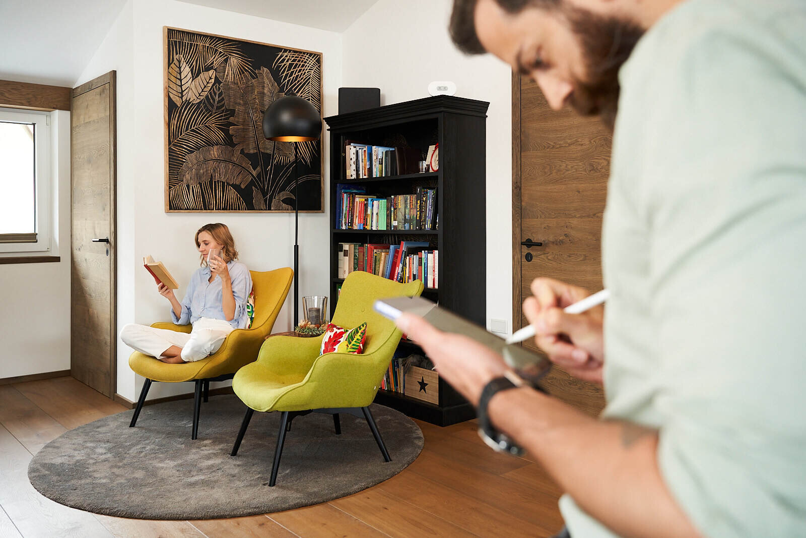 Die offene Wohnküche mit Leseecke hat einen Zugang zur Terrasse und bietet Ausblicke auf ein herrliches Panorama.