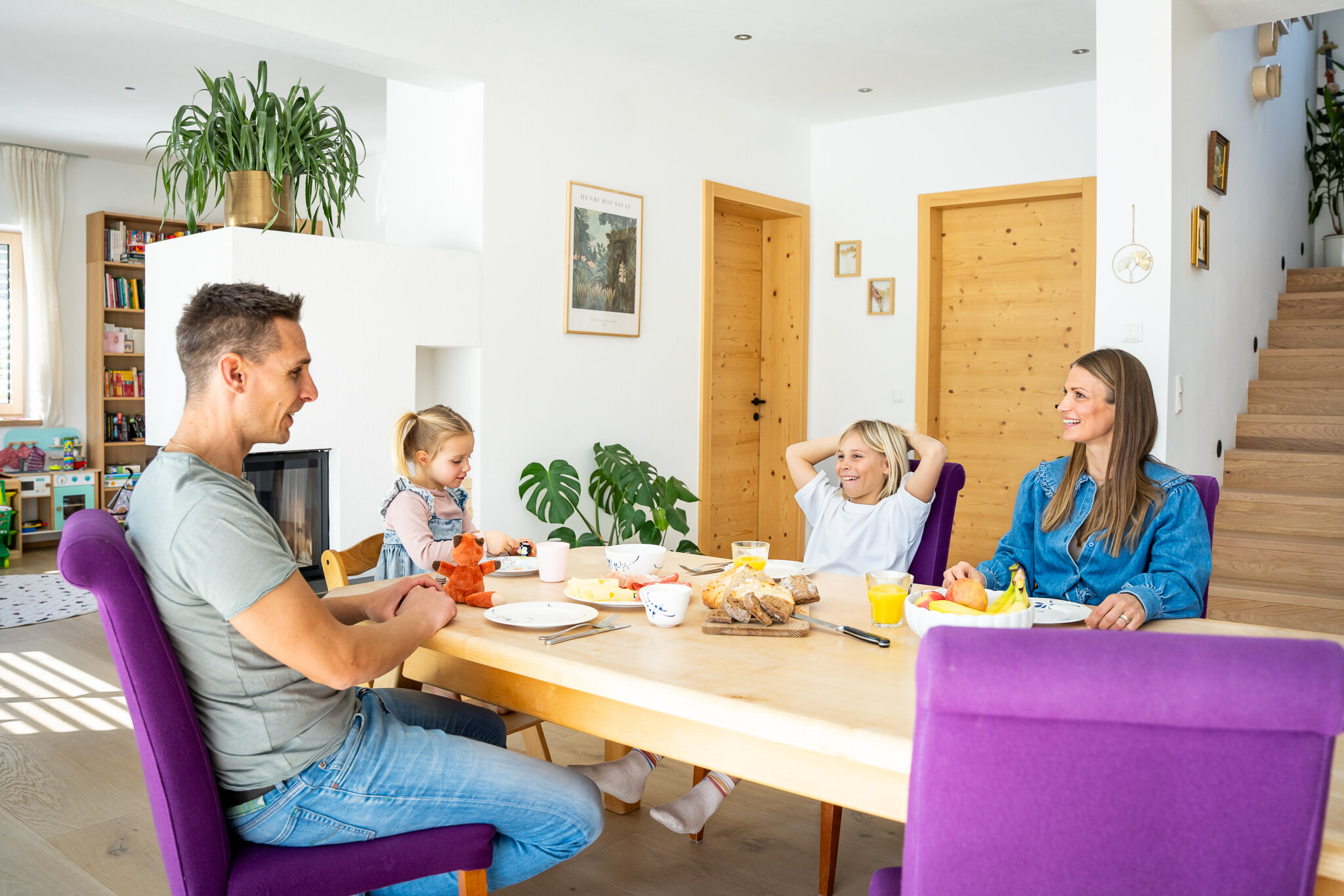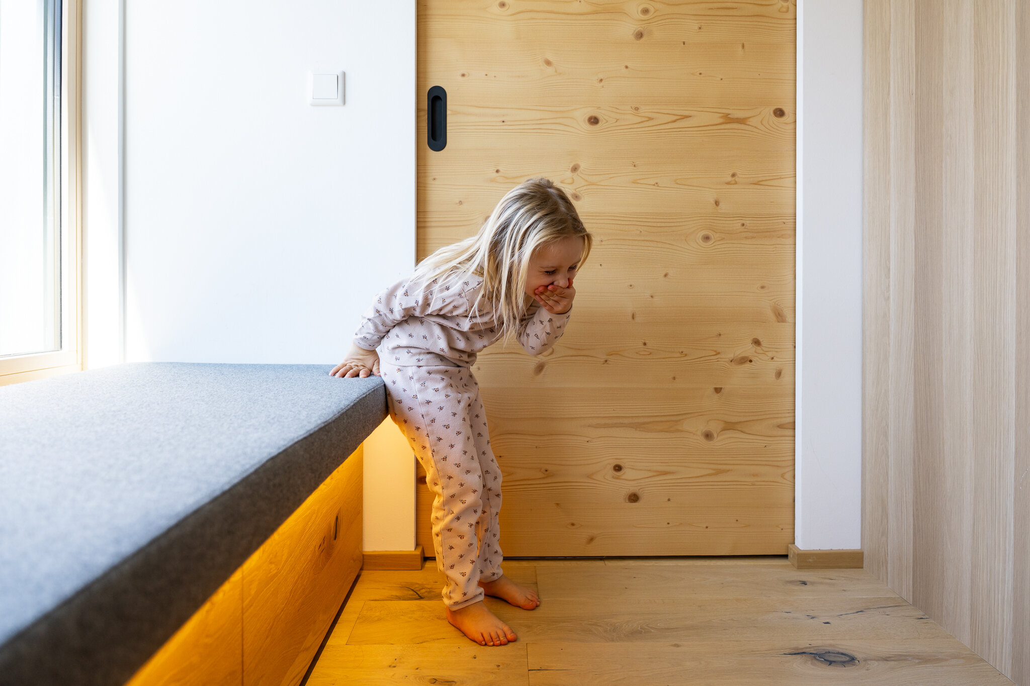 Ein weiteres Highlight in diesem Zuhause: Familie M. hat sich für überhohe Türelemente entschieden und Türen mit einer Stocklichte von 220 cm verbaut. Die Oberfläche in der Holzart Fichte Ast und der Farbnuance Wengen (C105+) ist gebürstet und unterstreicht den natürlichen Charakter der Türen.