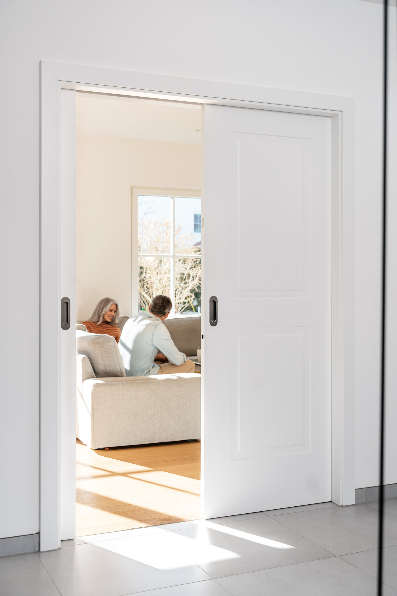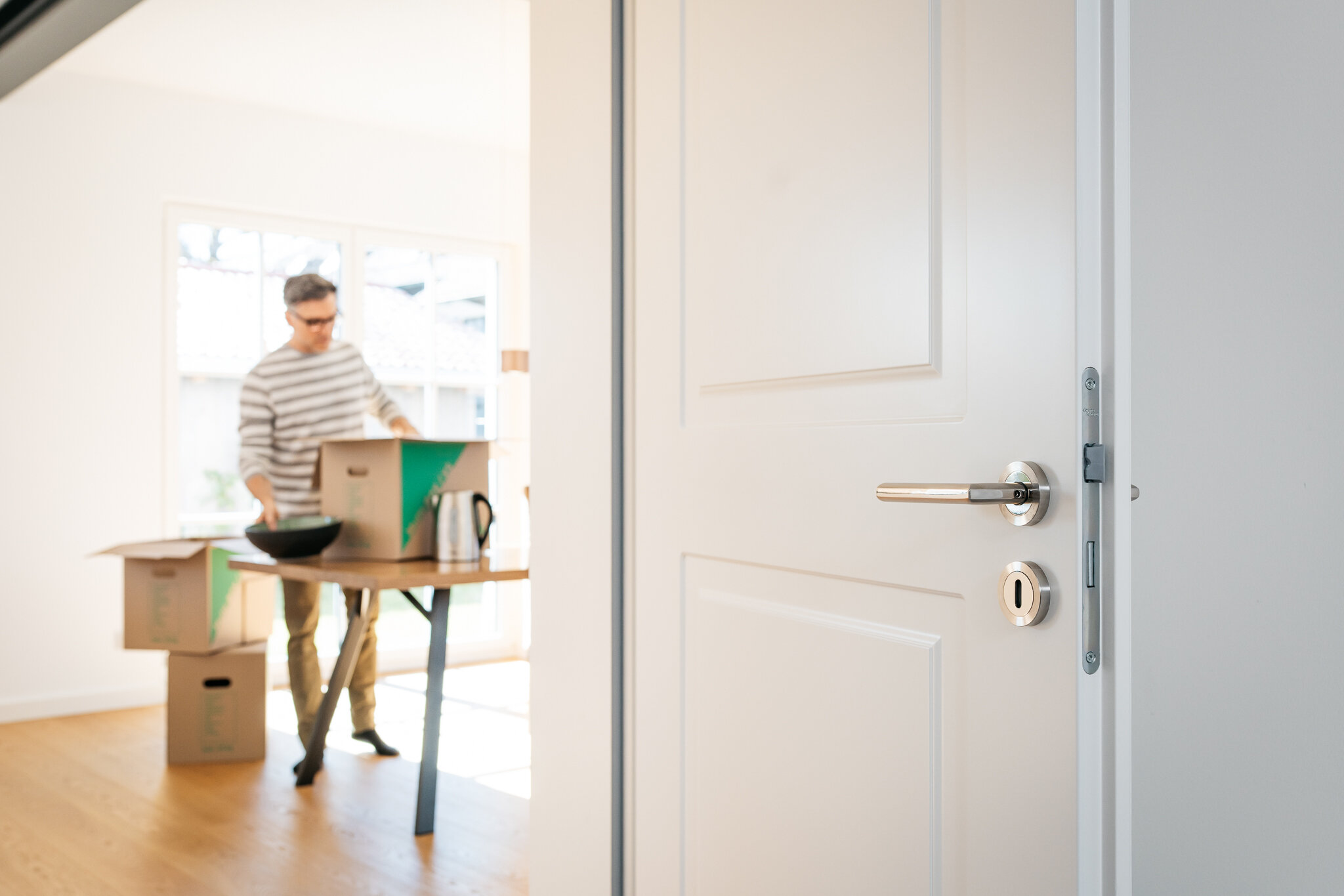 Und wer beim Renovieren nur an den Tausch der Fenster, neue Wandfarbe und neue Küche denkt – der irrt. Denn auch Innentüren segnen nach Jahrzehnten das Zeitliche. Und so haben sich Herr und Frau von E. – passend zu ihrem Wohnstil – für elegante, schlichte Türen in Weiß aus unserem Haus entschieden.