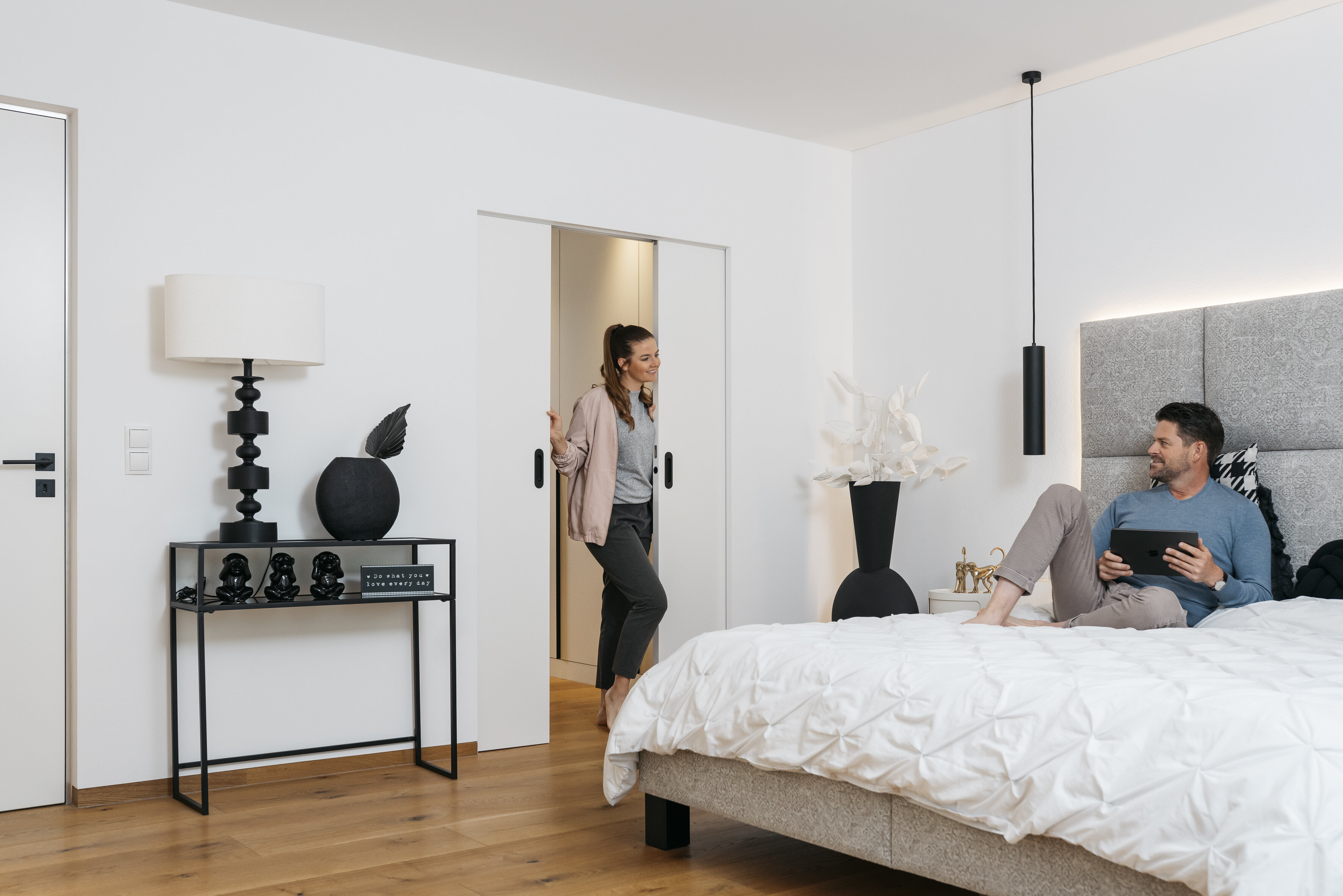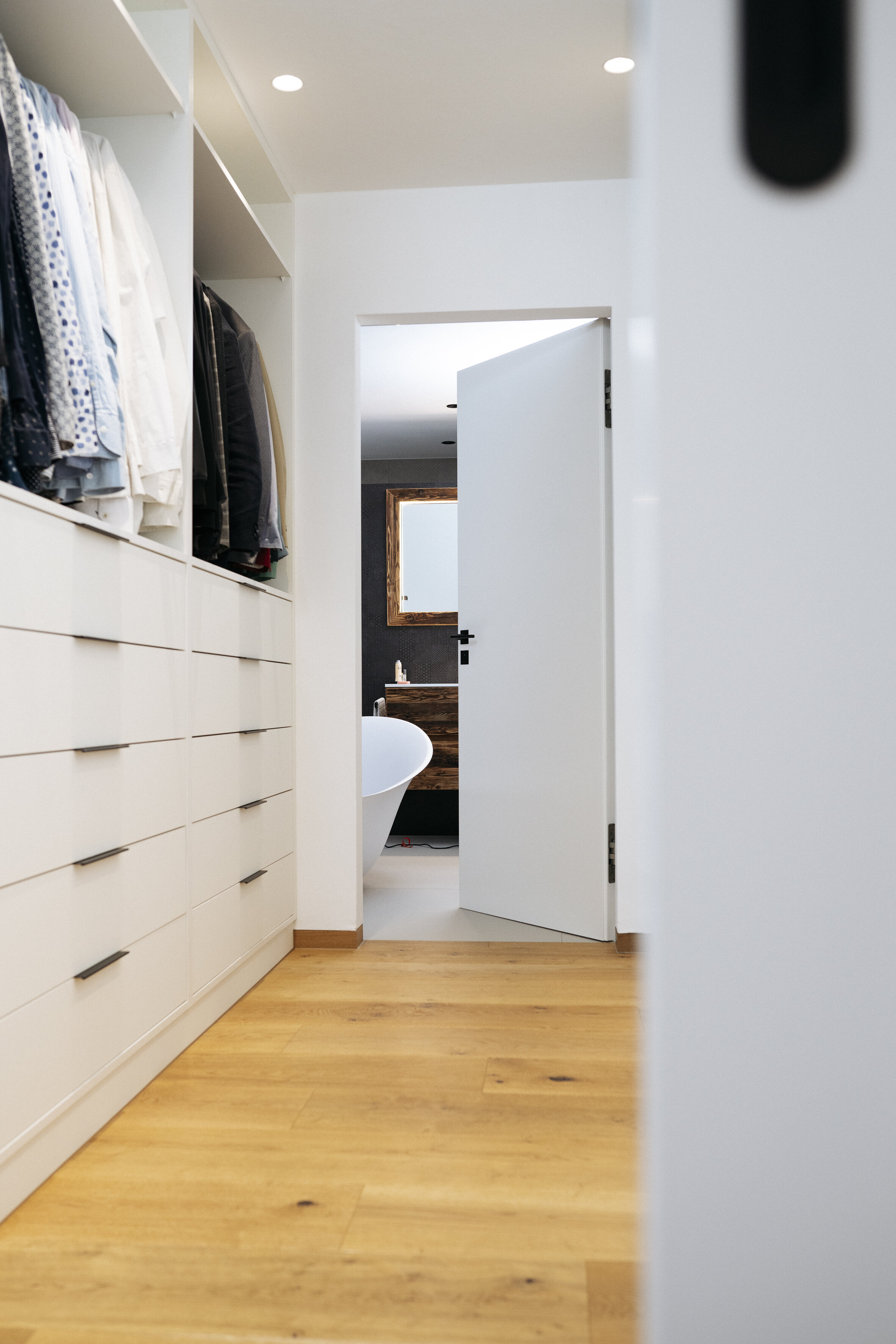 Praktisch und stilvoll zugleich: Der begehbare Kleiderschrank, der mit einer praktischen, platzsparenden Schiebetür von Koch Türen vom Schlafzimmer abgetrennt ist, bringt nicht nur Ordnung, sondern auch Raffinesse in den Raum. Er verbindet Funktionalität mit Ästhetik – genau das, was sich Herr und Frau T. gewünscht haben.