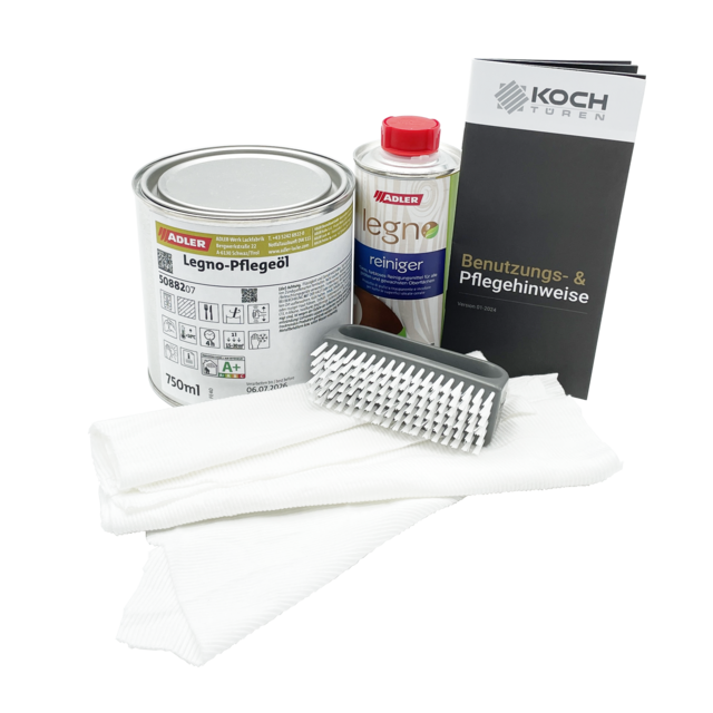 Pflegeset zur Auffrischung von geölten Holzoberflächen bestehend aus: Pflegeöl Natur 0,75l, Öl-Oberflächen Reiniger 0,25l, Öl-Oberflächen Reinigungsbürste, 3 Stk. Auftragstücher und Pflegeanleitung. Kompatibilität Produkte: O37, O27, O7. Ergiebigkeit ca. 8 - 12 Elemente pro Einheit.