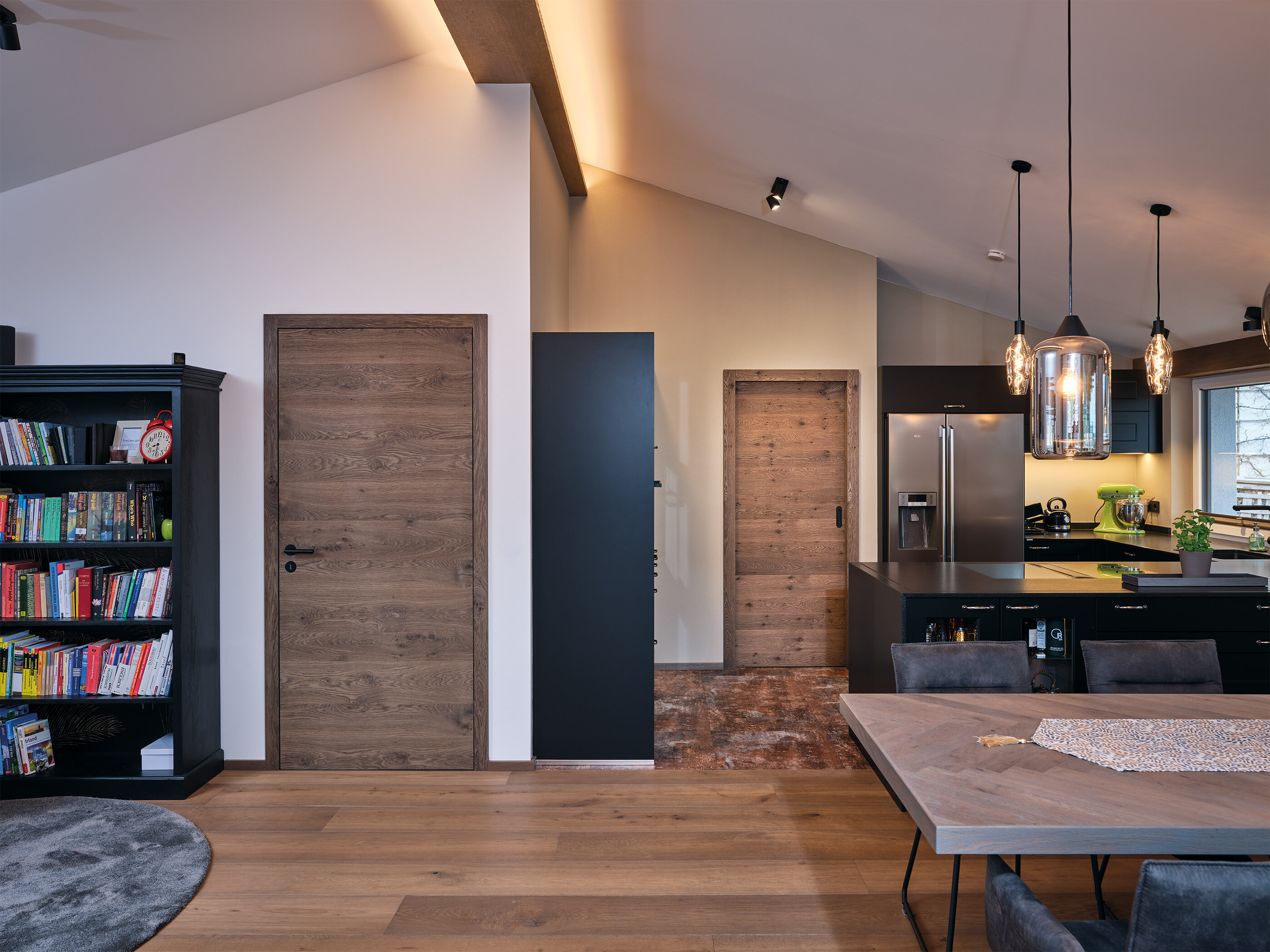 Das Türblatt kann in beide Richtungen öffnen: Klassisch in den Raum oder – gerade bei kleinen Räumen wie WCs – nach außen in den Gang. Der Vorteil? Die Optik im Gang bleibt einheitlich und stilvoll.