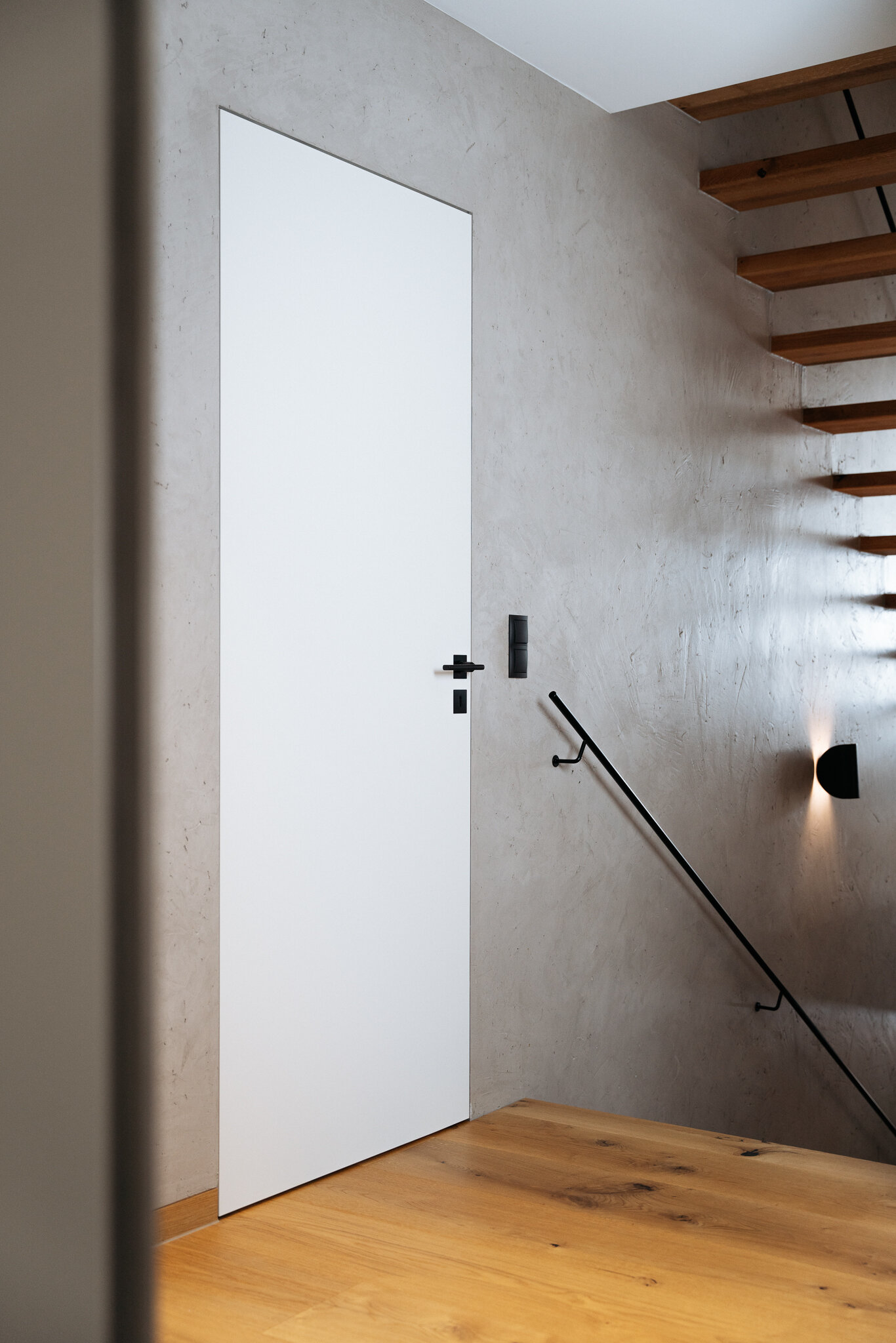 Der Pfostenstock lässt sich auch auf der Gangseite flächenbündig mit der Wand setzen (siehe Beispiel) – für eine besonders moderne, puristische Optik. In diesem Fall empfiehlt es sich, auch das Stock- und Türblatt flächenbündig auszuführen.